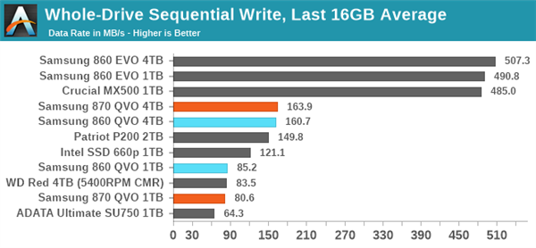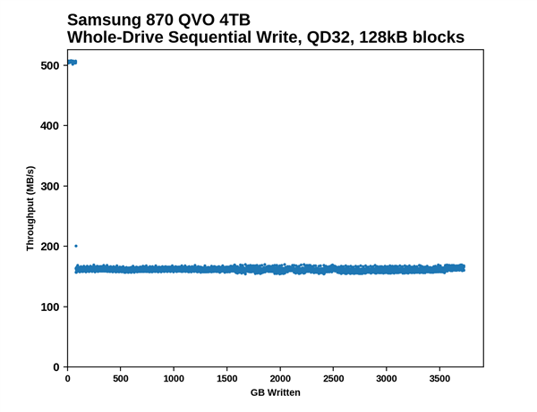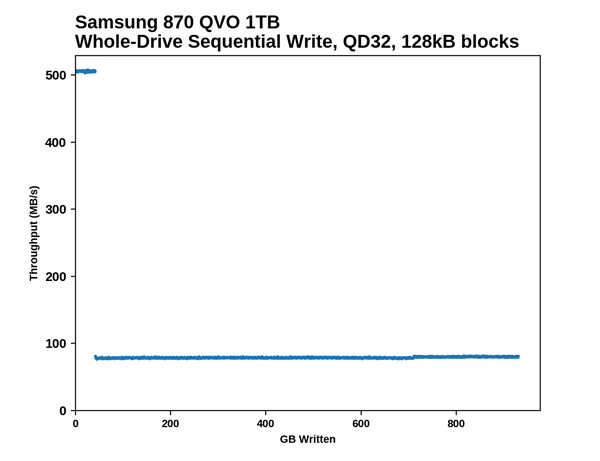 AnandTech已经对870 QVO进行了详细的测试,其他没什么意外,这里只看看缓存内外的写入情况。