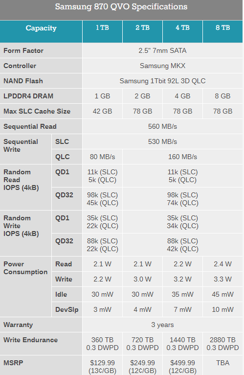 870 QVO系列的详细规格,1/2/4/8TB型号分别搭配1/2/4/8GB LPDDR4缓存,同时还设置了SLC缓存以提升性能,2/4/8TB的都有78GB,1TB则只有42GB。