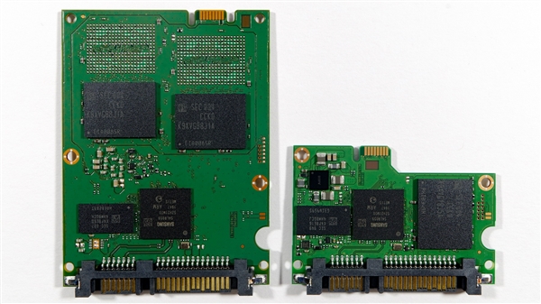 左右分别是4TB、1TB的电路板正反面。很显然,1TB、2TB只需一颗和两颗闪存芯片,再加一颗主控、一颗缓存就搞定了,所以PCB非常短小精悍,1TB的留了个空焊位。4TB的正反各两颗闪存芯片,补上四个空焊位那就是8TB。