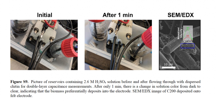 研究团队将甲壳素沉积在毡状电极上,并将其作为钒氧化还原流电池的一部分进行测试。测试结果显示峰值功率密度改善了~100 mW cm–2。性能的提升固然可喜,但该团队同样对该设计的可持续发展性质感到兴奋。