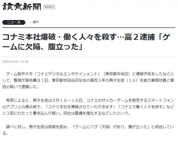 今日(7月1日)据日本读卖新闻报道,一名东京都世田谷的高二男学生(16岁),因为在6月16日-18日,在网上多次扬言要“爆破科乐美本社”“杀掉科乐美员工”,被警方以涉嫌威力业务妨害逮捕。