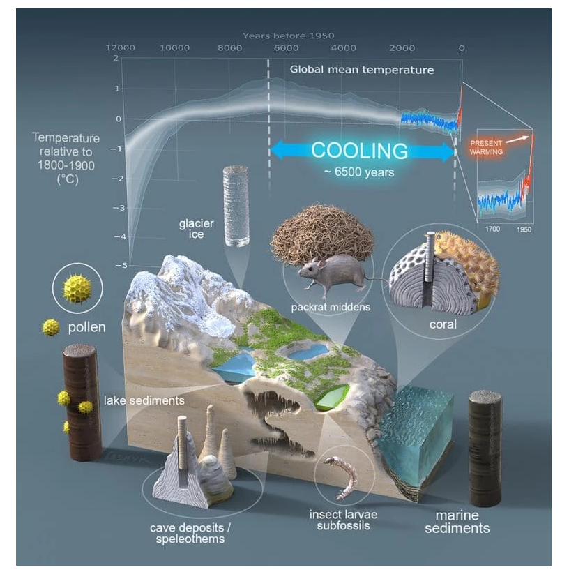 为了找到答案,研究人员一直在整理各种来源的数据,这些数据可以追溯到数千年前。几个月前,一个由93名科学家组成的团队发表了一份特别全面的古气候数据记录,时间跨度为过去12000年。它包括1319条数据记录,这些数据来自湖泊沉积物、海洋沉积物、泥炭、洞穴沉积物、珊瑚和冰川冰芯等样本,从全球679个地点收集。