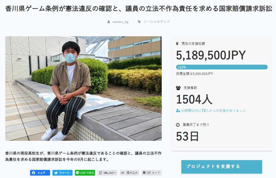 此前我们曾报道过“日本学生开众筹起诉游戏防沉迷条例违宪”一事,香川县的某高中生渉氏,计划通过众筹获得500万日元的诉讼费用,目前这一众筹的目标已经达成。据悉,高中生渉氏计划就香川县通过的“游戏成瘾条例”向政府发起诉讼,起诉政府不作为、违宪。