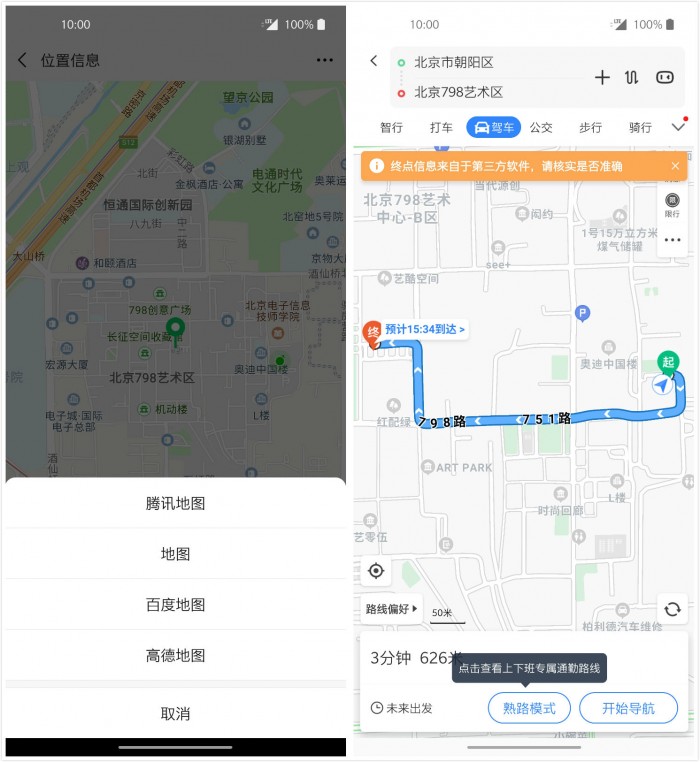 国内用户在用的地图应用基本就是高德、百度两家,安卓、苹果都允许你跳转到相应的地图中查看路线,过程还算顺畅,当然设置为默认应用的话体验会更好。