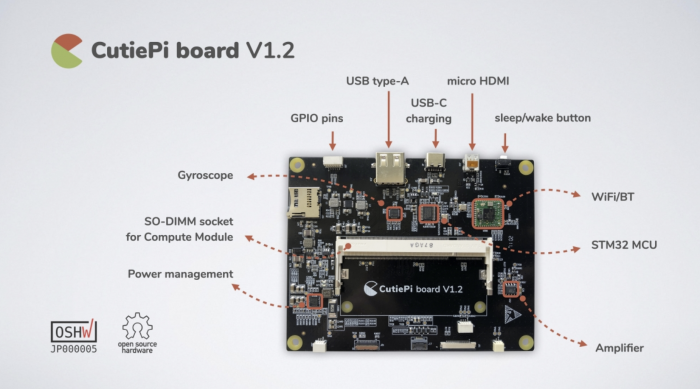 CutiePi在上面和周围增加的是电子元件和组件,使其成为一个可用的终端设备。这包括一个8英寸1280×800的屏幕,各种端口。WiFi 802.11 b/g/n和蓝牙4.0,还有一块5000毫安时的电池,目前测算可以提供5小时的使用时间。甚至还有6个GPIO针脚,方便需要连接一些USB没有覆盖到的硬件用户。