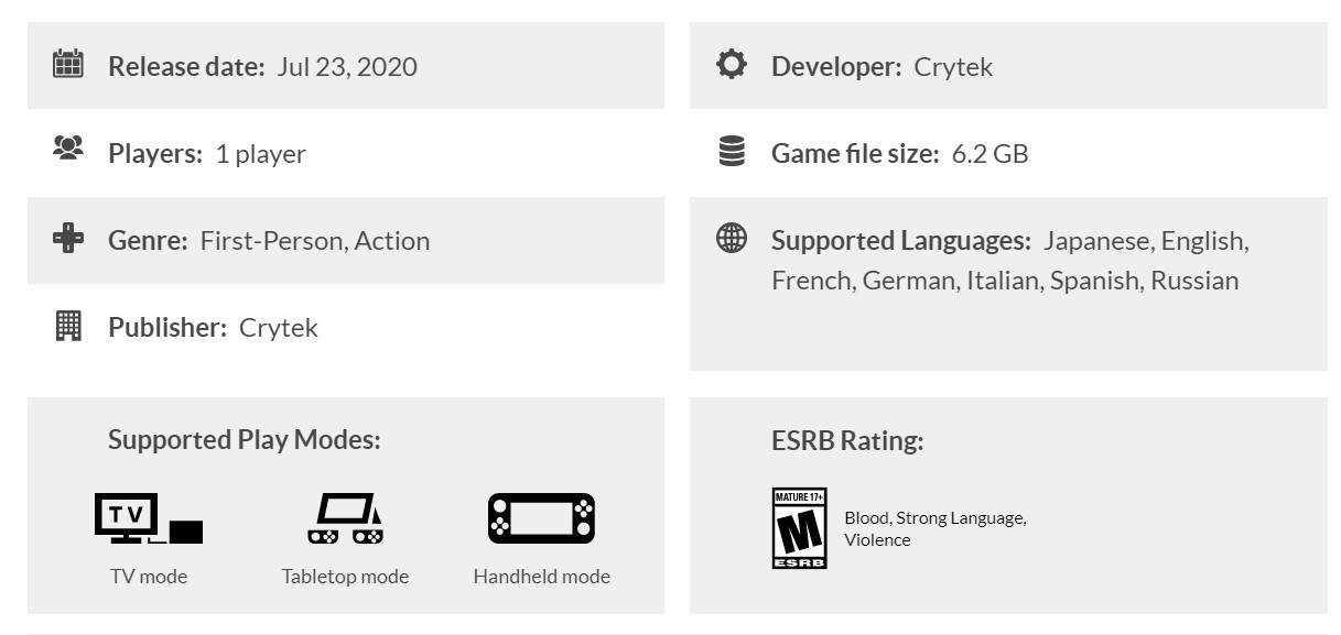 《孤岛危机:复刻版》目前已经上架任天堂美服商城,2020年7月23日发售,售价30美元,Switch版游戏截图也得以首次曝光。根据商城页面,Switch版游戏容量为6.2GB(此前Xbox One版容量为7.01GB),支持Switch三种模式(电视模式/掌机模式/平板模式),开发商为Crytek,支持单人,语言方面暂时没有看到中文。