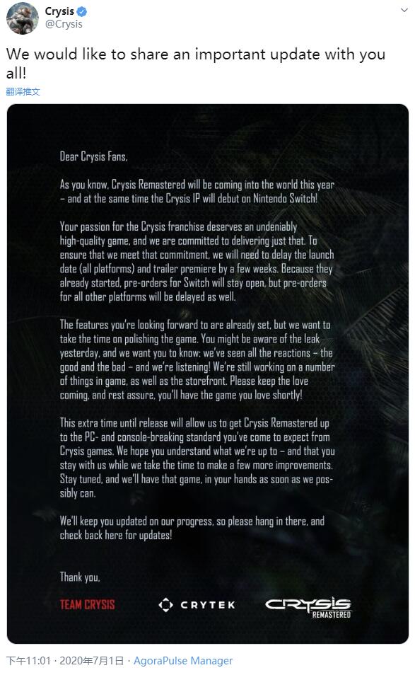 Crytek官方已在推特发布消息,表示将会推迟发行,进一步改善图形质量。