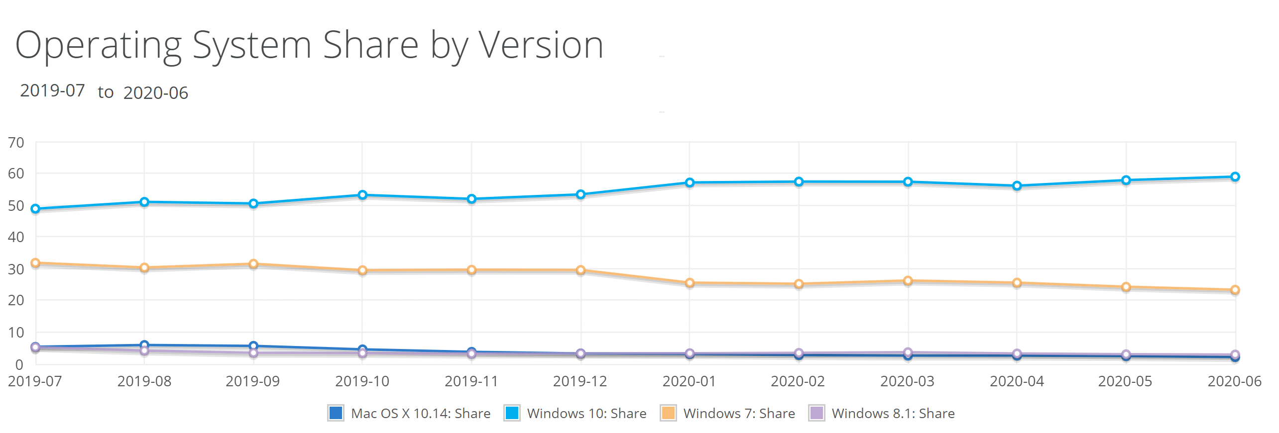 Netmarketshare发布了2020年6月的操作系统与全球浏览器市场份额报告。本月的数据显示,Windows 10的份额为58.93%,高于上月的57.83%。 Windows 7的份额从24.28%继续下降到23.35%,微软Windows操作系统整体维持在86.69%的份额。
