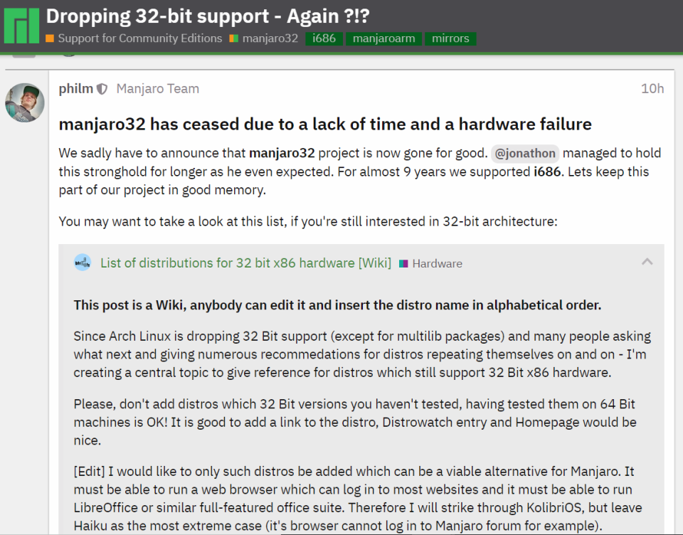 不幸的是,我们不得不宣布 manjaro32 项目现在已经一去不复返了。@jonathon 成功地将这个据点维持了更久,甚至超出了他的预期。在近 9 年的时间里,我们一直支持 i686。让我们对这部分项目留下一个美好的回忆。