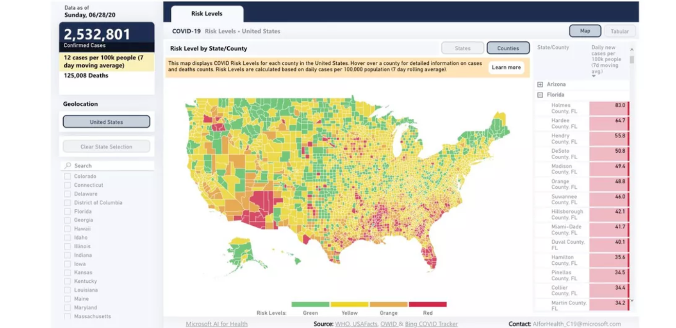 用户可以放大或缩小然后找到其所在的州和县。一旦找到自己的位置,地图就可以显示每天每10万人新增新冠肺炎病例的数量,且为连续7天滚动显示,另外还有用户所在位置在地图上的颜色、病例数量、死亡人数等。在地图的左边用户还可以选择特定的州从而让自己能更容易地找到自己所在的县。在屏幕的右边,如果用户选择了一个州那么则可以单击加号并滚动到各个县。