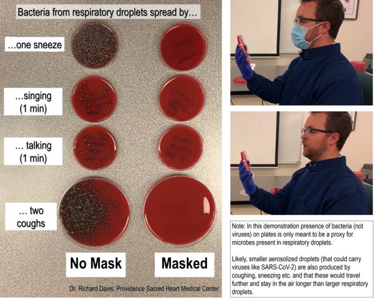 他把琼脂培养板拿在离脸一英尺远的地方,然后他对着琼脂培养板打喷嚏、唱歌、说话、咳嗽两次。他戴着口罩也做了同样的事情,然后他把结果公布出来。琼脂培养板在微生物学中用于培养各种病原体的培养物。戴维斯是华盛顿州斯波坎市普罗维登斯圣心医疗中心的临床微生物学实验室主任,所以他显然能够准确地知道这些培养皿的工作原理。