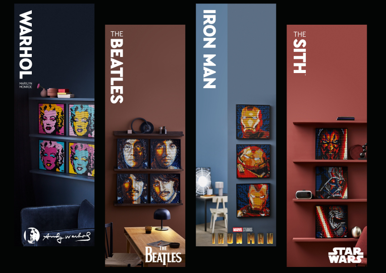 目前乐高艺术系列共有四套:包括安迪·沃霍尔创作的玛丽莲·梦露画作、披头士乐队成员的肖像、以各种版本的钢铁侠套装为特色的套装,以及以流行反派为基础的星球大战套装。