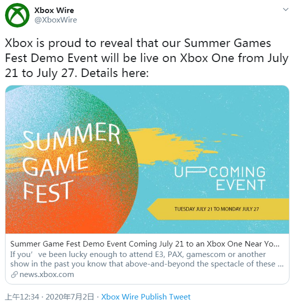 感兴趣的朋友可在 7 月 27 日前登陆 Xbox One 仪表板收看 Summer Game Fest,其中一些内容还可能在稍后的 Xbox One Demo 频道上出现。