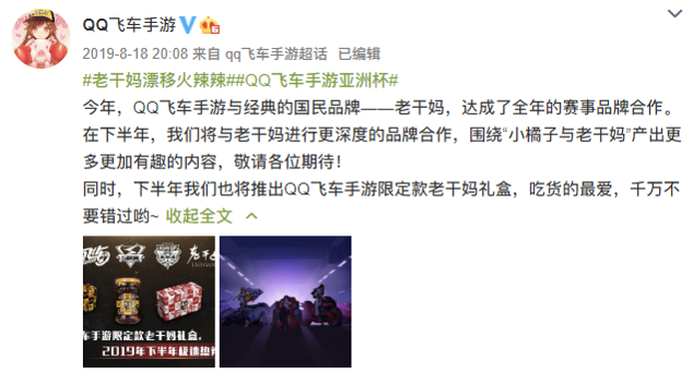 从微博考古可以看到,去年8月,腾讯开始落地执行,腾讯@QQ飞车手游官宣与老干妈达成全年的深度合作,此后老干妈开始在QQ飞车手游里频繁出镜。