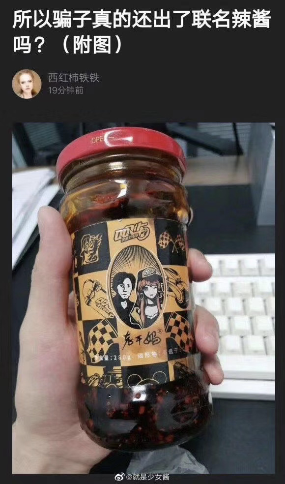值得注意的是,跟腾讯QQ飞车的“乌龙”合作也正是在这一时期推出的,看起来是一系列面向年轻人的造势营销套路。甚至还有网友晒出了QQ飞车与老干妈的联名辣椒酱,难道骗子还真的做戏做全套,生产了假冒的老干妈辣酱?