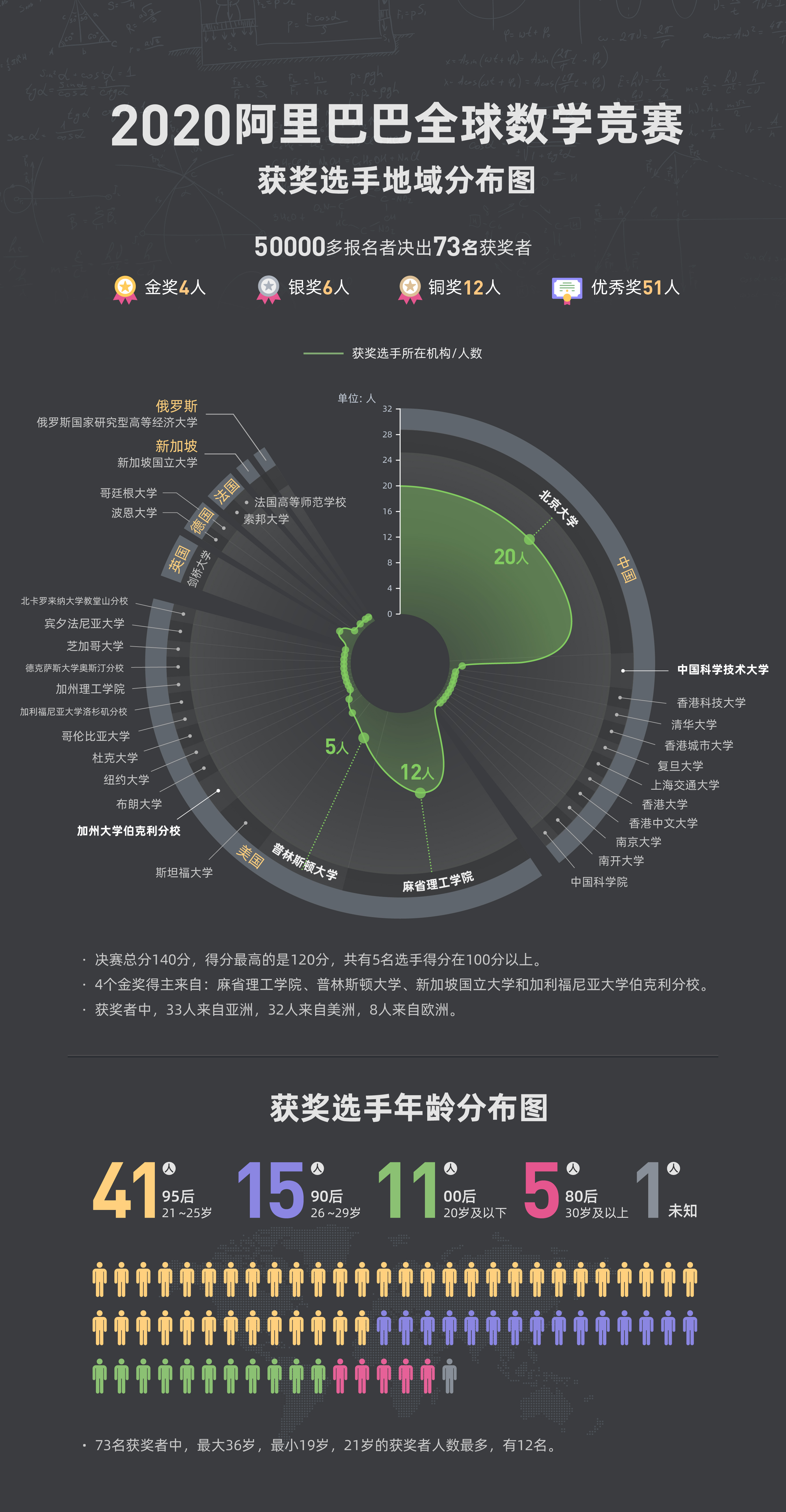 “最强73人”包括4名金奖选手、6名银奖选手、12名铜奖选手和51名优秀奖选手,他们来自8个国家,就读或毕业于33所高校。