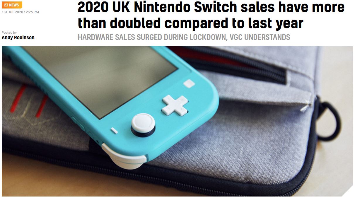 据VGC报道,较之于2019年,2020年上半年英国Switch主机的销量翻了两倍以上,英国Switch的销售激增开始于3月初,在5月份的时候达到顶峰,因为新冠疫情而处于隔离状态的英国国民,对电子游戏的兴趣有了明显的增长。