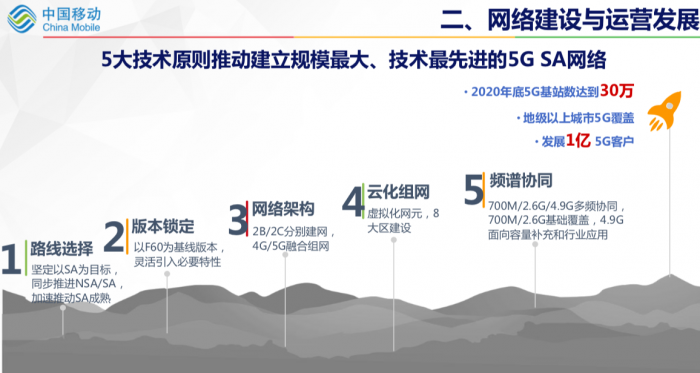 其次是推动网络建设与运营发展。通过五大技术原则推动建立规模最大、技术最先进的5G SA网络,坚定地以SA为目标,同步推进NSA/SA,加速推动SA成熟;以2019年6月冻结的F60为基线版本,灵活地引入必要特性;TO B和TO C分别建网,4G/5G融合组网;全虚拟化网元,8大区集中建设云资源池;700M/2.6G/4.9G多频协同,700M/2.6G作为基础覆盖,4.9G面向容量补充和行业应用。