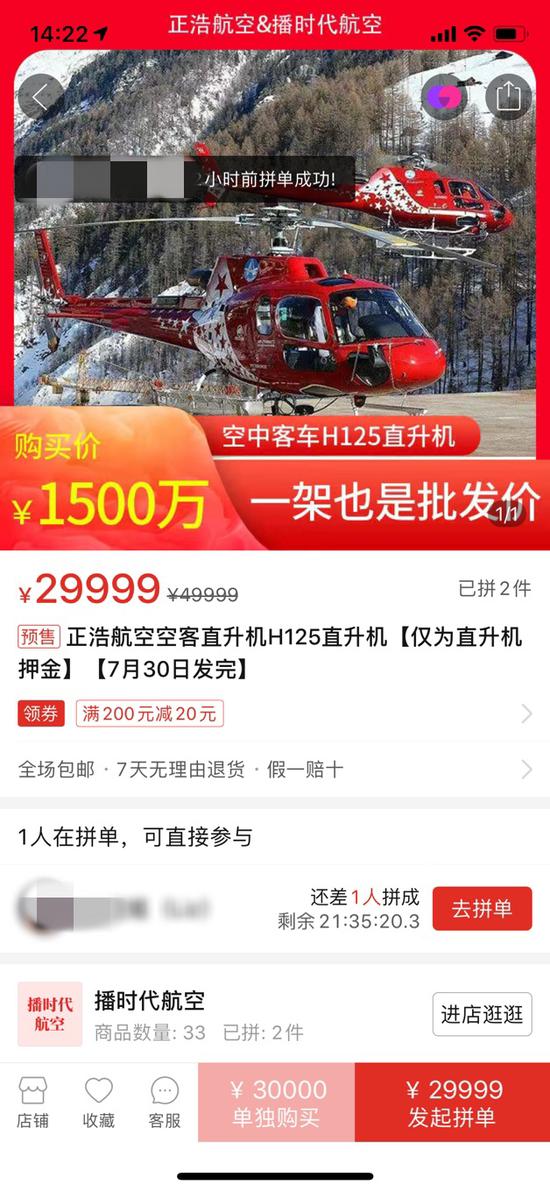 本场直播活动累计吸引了百万拼多多网友观看,截至活动结束时,直播间里一架售价1500万元的空客H125直升机,显示“已经拼单2件”。