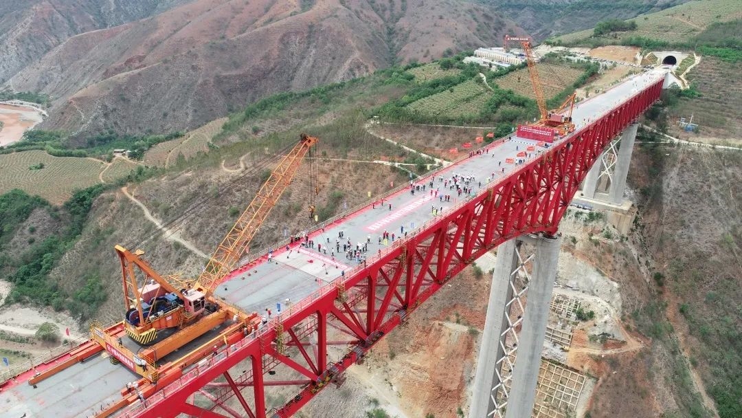 7月1日下午,随着最后一块桥面板精准落入预定位置,中老铁路(中国-老挝)中国段玉磨铁路(玉溪-磨憨)的元江双线特大桥顺利实现合龙。元江双线特大桥位于云南省元江哈尼族彝族傣族自治县境内,全长为832.2米,是中老铁路全线重点控制性工程,也是我国首次建造的最大跨度上承式连续钢桁梁铁路桥。