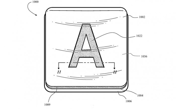 苹果提出的解决方案包括 一种键盘的键帽,它包括一个由顶部外表面组成的键体,该顶部可以是透明的,键的字母连接到透明主体的底面,挡光材料定义了一个字形。所以图案可以在按键内部,而不是印在表面。苹果的应用详细描述了许多不同形状和形式的按键顶部如何时尚化,但它也提到了另一个与背光有关的选择。如果背光照明改变颜色,键帽可以更显著地改变颜色。光线不是从键的字母和其侧面照射过来,而是可以是除了字母以外的所有东西都被照亮。此外,这种照明可能来自于会改变颜色的灯光。