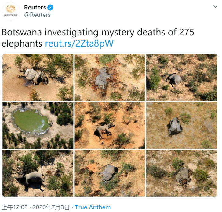 大象死亡事件可追溯到3月份。据美国哥伦比亚广播公司新闻报道,野生动物保护慈善机构 "大象无国界"(Elephants Without Borders)创建了一份关于死亡事件的报告,发现这涵盖所有年龄和性别的大象,而一些还活着的大象则显得昏昏欲睡、憔悴不堪、神志不清。