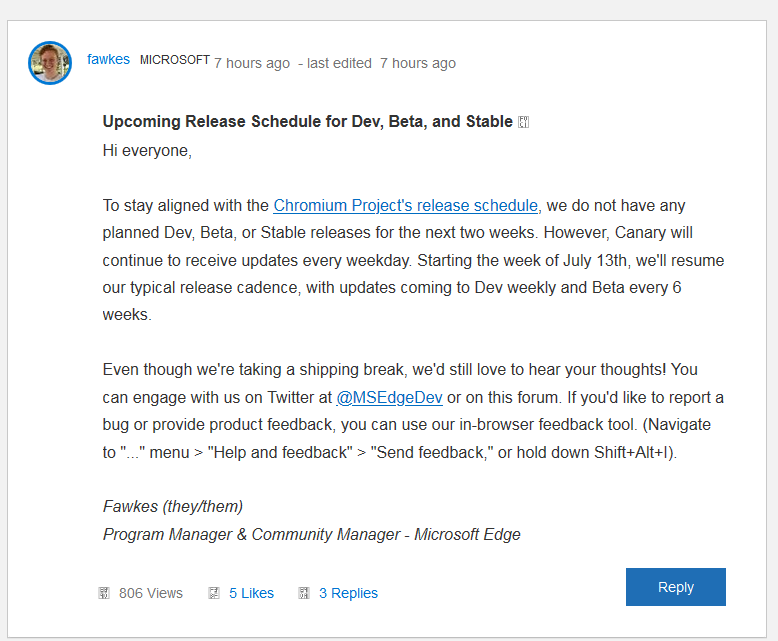 虽然暂停了 Edge 浏览器的更新,但是用户依然可以在推特上私信 @MSEdgeDev 或者在论坛上留言发表自己的反馈和建议。如果你想要反馈 BUG,那么依然可以通过浏览器内置的反馈工具进行提交。(导航到“...”菜单>“帮助和反馈”>“发送反馈”,或者按住 Shift+Alt+I)。