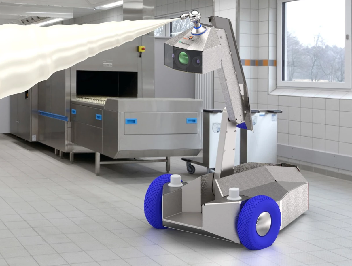 这款机器人实际上有两个版本。一种型号是装在现有的传送带上,它被放置在生产线上,从内部清洁设备。另一种有动力轮子和可伸展的手臂,让它可以移动,同时伸手去清洁天花板、墙壁和机器的外表面。它利用雷达和超宽带无线电传感器在房间内导航、识别物体并避开障碍物。