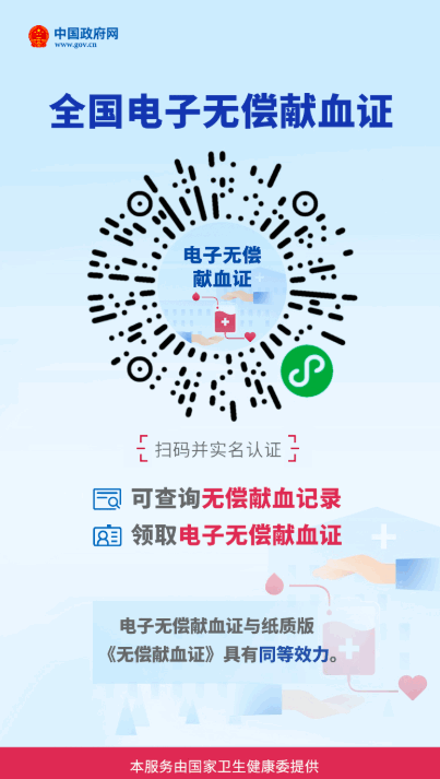 今日,中国政府网官方微信号发布信息显示,由国家卫生健康委医政医管局推出的【全国电子无偿献血证】,已在在国务院客户端小程序上线。