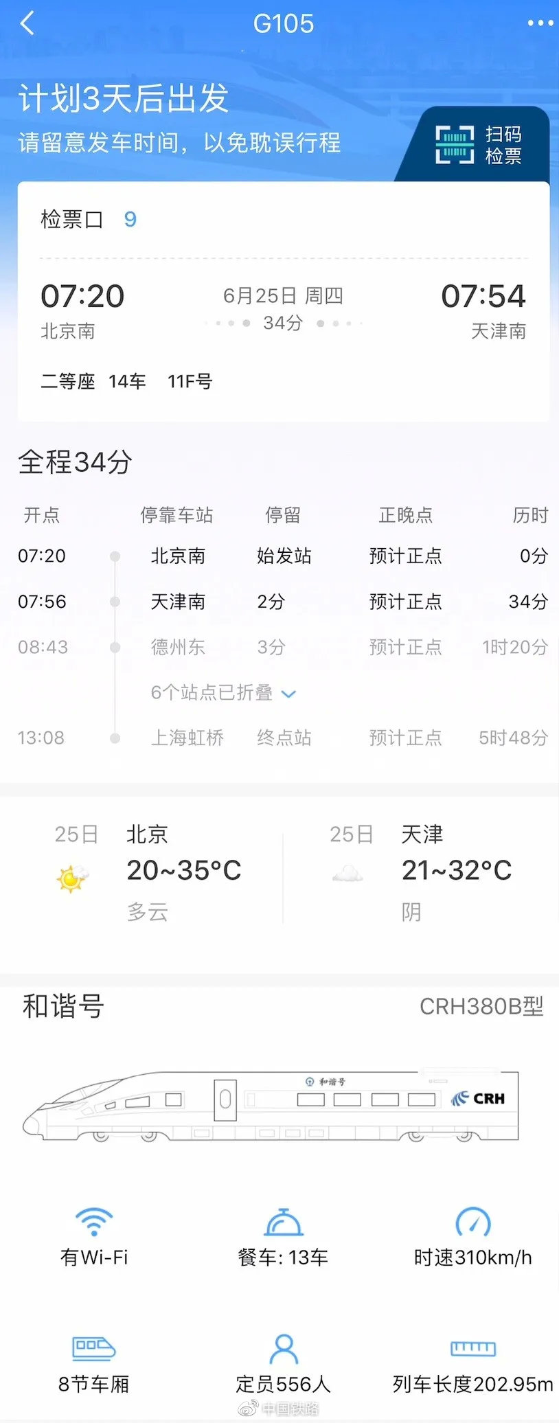 ▲点击个人行程,进入行程详情页,查看对应的经停站、车次信息、站点天气、以及推荐的到达站点周边相关酒店服务。