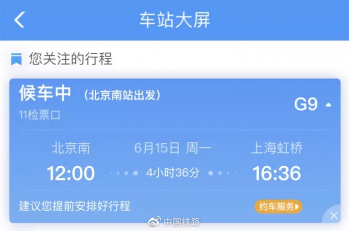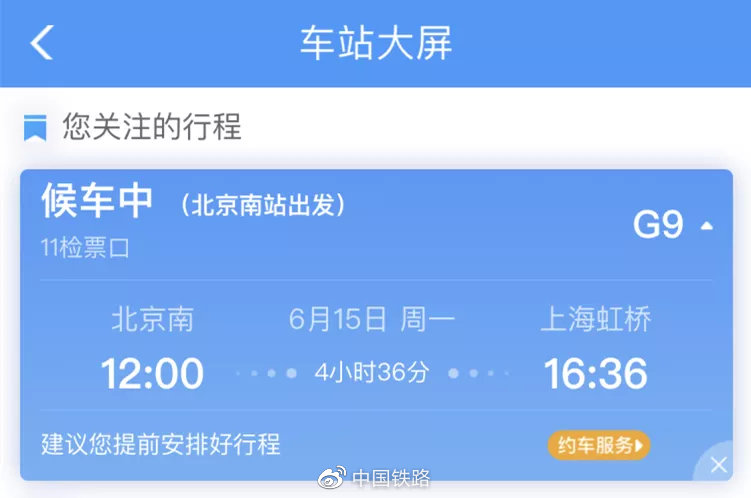 新版铁路12306APP首页,支持显示一个最近关注的行程。如果亲朋好友乘坐火车出行,你想了解他们的乘车信息。什么时候发车?什么时候到站?那么,一定不要错过这个功能!