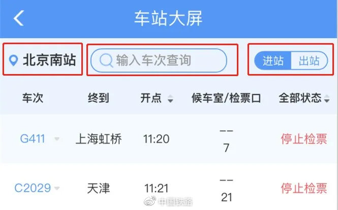 ▲进入车站大屏后,可以选择车站、输入车次查询,同时可以选择进出站,查询相关车次的候车室/检票口及状态。