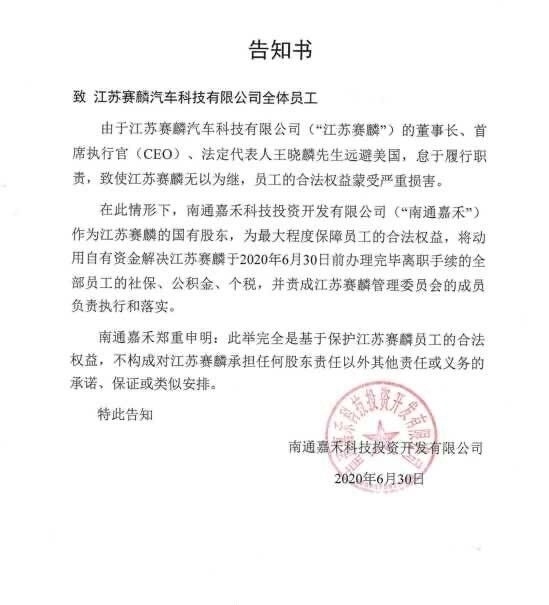 6月30日,江苏赛麟的国有股东南通嘉禾表示,江苏赛麟汽车董事长/CEO/法定代表人王晓麟远避美国,使江苏赛麟无以为继。