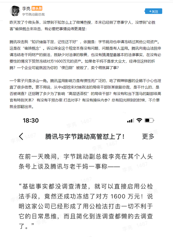 字节跳动副总裁李亮也公开提出质疑:“基础事实都没有调查清楚,就可以直接启用公检法手段,竟然还成功冻结了对方1600万元!说明这家公司已经形成了用公检法打击一切不利于它的日常思维,而且简化到连调查都懒的去调查了。”