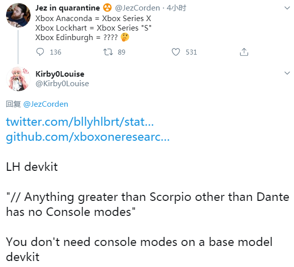 除了已知的 Lockhart(或为 Xbox Series S)和 Anaconda(即 Xbox Series X),还有传闻中的 Dante 开发套件(允许开发者访问 Lockhart 配置文件的特殊模式),已经新曝光的“Edinburgh”和“Count”。