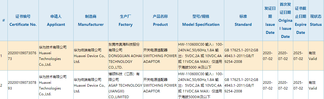 这两年,华为在手机快充功率方面似乎有点“不思进取”,最大仍然停留在40W,而友商已经做到65W,甚至在向100W迈进。根据3C认证查询,华为一款型号“HW-110600C00”的手机充电器刚刚通过认证,最大功率达到了66W,对应电压11V、电流6A,同时也兼容现有的10V4A 40W快充。