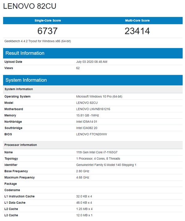 现在,GeekBench数据库中出现了联想的一款11代酷睿轻薄本,型号不详只有一个“82CU”的编号。