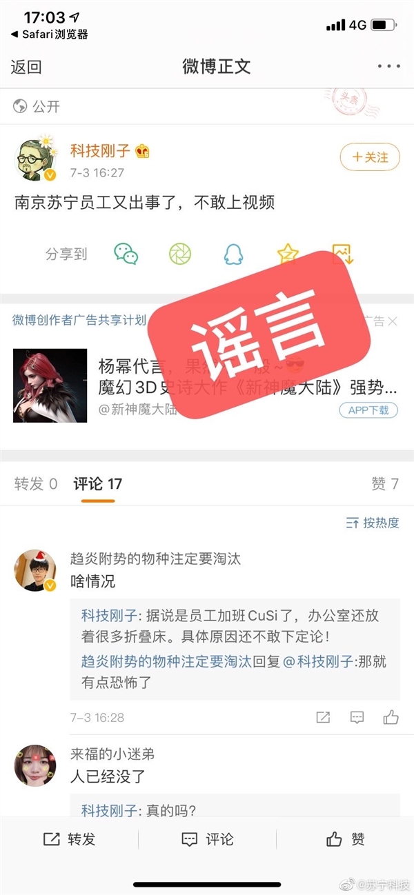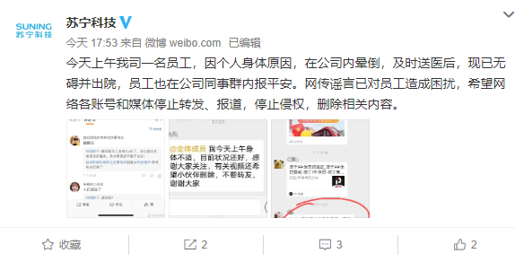 7月3日,有网传消息称,苏宁公司南京的一名员工在上班期间倒地猝死。曝料者还称,自己手里有相关视频,但是不敢放出。对此,苏宁官方澄清表示:“今天上午我司一名员工,因个人身体原因,在公司内晕倒,及时送医后,现已无碍并出院。”