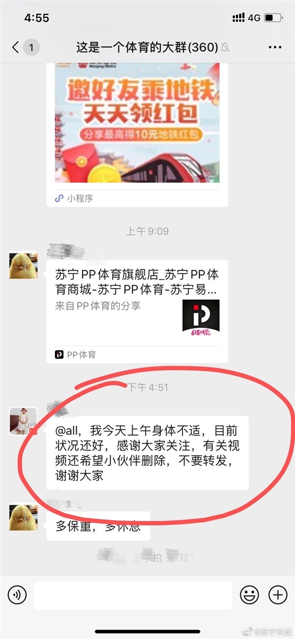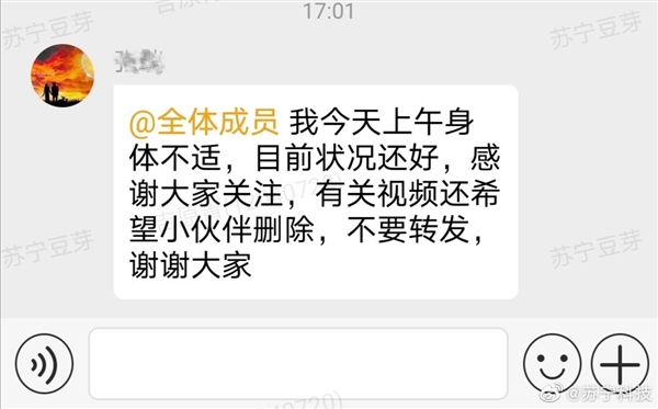 同时,苏宁还贴出了当事员工在公司同事群内报平安的截图。