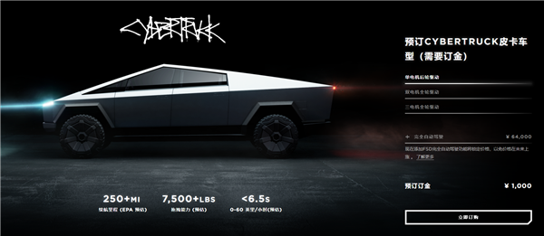 等了大半年,特斯拉中国终于开启了电动皮卡Cybertruck的预订,号称“比卡车更实用,比跑车更性能”。特斯拉中国官网页面显示,Cybertruck预订订金为1000元。提供单电机后轮驱动、双电机全轮驱动、三电机全轮驱动三款车型。