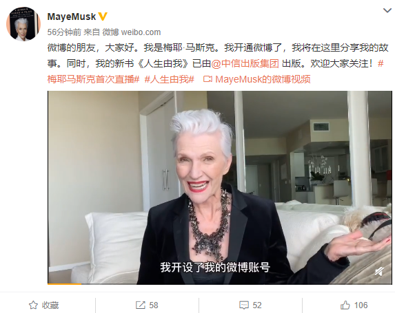 6月23日,梅耶·马斯克宣布正式入驻微博,同时,她的新书《人生由我》已由中信出版集团出版。