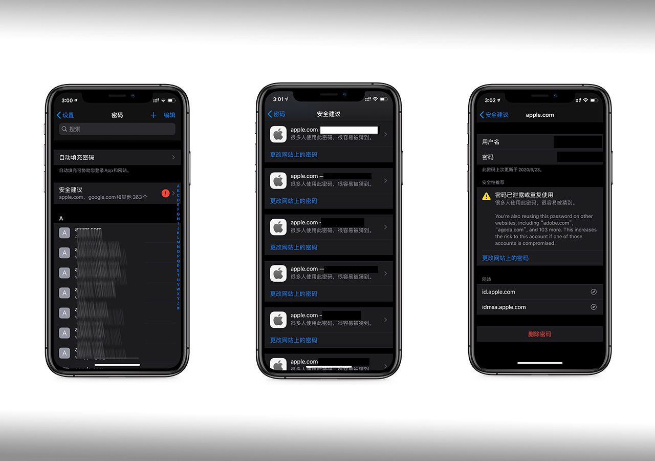 特别是有一个新的提醒,也是用户最关心的问题之一。据苹果公司介绍,iCloud 钥匙串现在可以验证你的密码是否涉及数据泄露。这一点很重要,不仅可以让你立即修改密码,还可以了解如果你使用重复或类似的密码,还有哪些其他账户可能会受到影响。