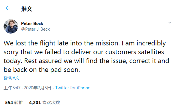 火箭实验室的首席执行官彼得·贝克(Peter Beck)在推特上为这次失败道歉。他在推文中表示“我非常抱歉,我们今天未能向客户交付卫星。请放心,我们会找到问题,纠正它,并很快回到平台上。”