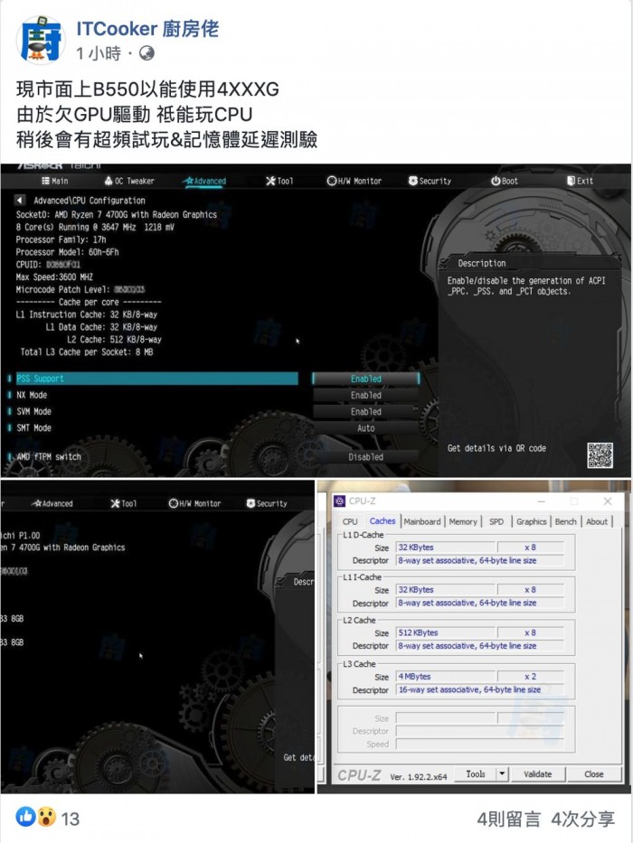 据图片可见,采用 7nm 的AMD Ryzen 4700G 拥8核16线程,预设时脉及最高Boost 时脉分别3.6GHz 及4.45GHz,L1 快取256KB,而L2 及L3 就分别有4MB 及8MB,测试平台用上 B550 晶片组主机板,至于实际性能方面,就未有交待。