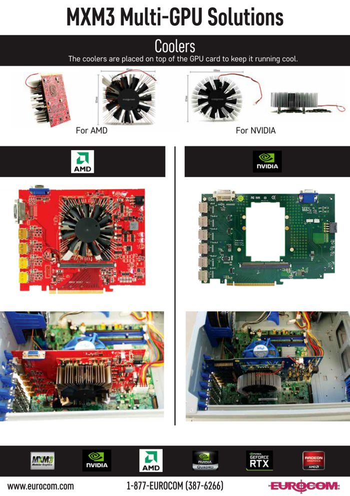 Eurocom将这些适配器营销为 "MXM3转PCIe Riser Cards",能够支持移动 MXM3 Radeon RX 580 或 GeForce RTX 2080 显卡,最高 TDP 为 150W。在散热方面提供了一个小型风扇和散热器,因为 MXM 卡原有的笔记本散热方案显然无法沿用。