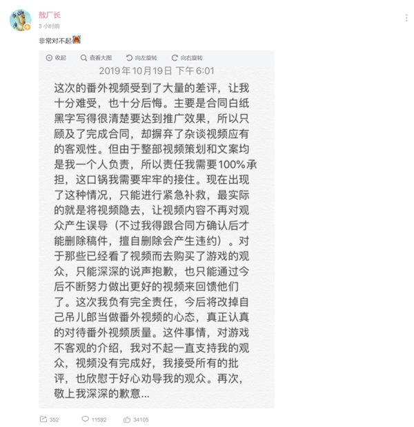 值得一提的是,敖厂长作为高人气游戏UP主,去年10月份因为恰饭《西游记之大圣归来》游戏而上了热搜,被网友骂的很惨,最后不得不道歉,表示合同白纸黑字写得很清楚要达到推广的效果,所以只顾及了完成合同内容,却摒弃了杂谈视频应有的客观性。但由于整部视频策划和文案均是我一人负责,所以责任我需要100%承担。