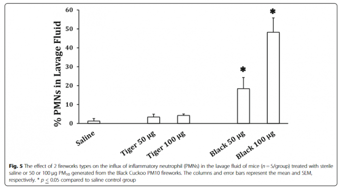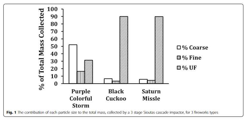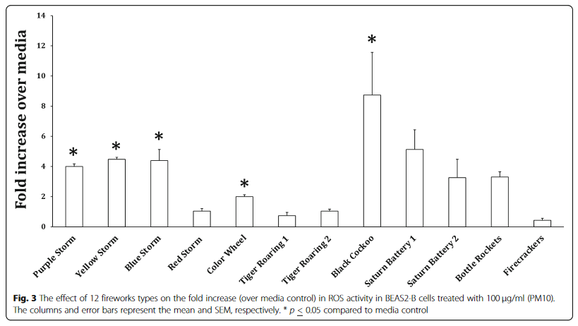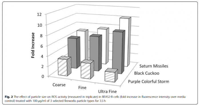 这项研究来自于纽约大学格罗斯曼医学院,科学团队评估了商用烟花的潜在毒性。在被测试的 12 种烟花中,发现有两种烟花的铅含量对人体有害。根据研究发现,Black Cuckoo(一种喷泉式的烟花)的毒性在这些烟花中是最强的,对人体细胞的伤害是无毒盐水的10倍。此外,还发现有 5 种烟花产生的颗粒会“显著”提升人体内有害氧化的速度。