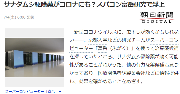 ·日本超级计算机“富岳”是世界排名靠前的超级计算机之一,目前设置在神户市,专家表示通过对病毒所含蛋白质使用了多达2028种现存医药成分来测试对抗性,目前发现驱绦虫药很有效,而更多的其他成分测试仍然在持续测试中。