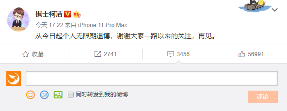 围棋国手柯洁今天在个人微博上宣布,从今日起个人无限期退博,同时谢谢大家一路以来的关注。柯洁没有透露退出微博的原因,可能是和他个人性格比较鲜明,一些言行引发不小的争议所致,或者微博上的种种影响了他在围棋和学业上的专心投入。