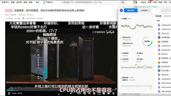 播放超多弹幕的B站视频无障碍,流媒体4K视频也轻松搞定,CPU占用率不高,但是面对本地4K视频就卡顿得不行了。